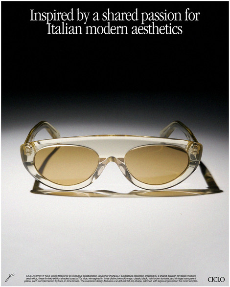 CICLO x PARITY joined forces for an exclusive collaboration, the VIGNELLI sunglasses collection. Inspired by a shared passion for Italian modern aesthetics, these limited-edition shades boast a 70s vibe, reimagined in three distinctive colorways: classic black, rich brown tortoise, and vintage transparent yellow, each complemented by tone-in-tone lenses. The oversized design features a sculptural flat-top shape, adorned with logos, and our ∞ trademark engraved on the inner temples.